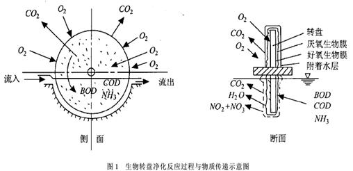 由電機、變速器和傳動鏈條等組成的傳動裝置驅動轉盤以較低的線速度在槽內轉動,并交替地和空氣與污水相接觸。接觸反應槽內充滿污水,轉盤經一段時間轉動后,會在其上附著一層滋生著大量微生物的生物膜,微生物的種屬逐漸穩定,微生物的新陳代謝功能也逐步地發揮出來并達到穩定的程度,污水中的有機污染物為生物膜所吸附降解。轉盤轉動離開污水與空氣接觸,生物膜上的附著水層從空氣中吸收氧,并將其傳遞到生物膜和污水中,使槽內污水的溶解氧含量達到一定的濃度,為生物降解提供充足的氧。在轉盤上附著的生物膜與污水以及空氣之間,除有機物(BOD、COD)與O2外,還進行著其它物質,如CO2、NH3等的傳遞,其原理如圖1所示。