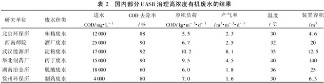 UASB是荷蘭農業大學幾名教授在AF基礎上發展起來的,其特點是反應器的上部設置1個氣、固、液三相分離器,混合液中的污泥能自動回到反應區以維持較多的生物量和較長的SRT,整個反應器由反應區和沉淀區兩部分組成。從表2可以看出,UASB具有很高的容積負荷率和污泥負荷率。